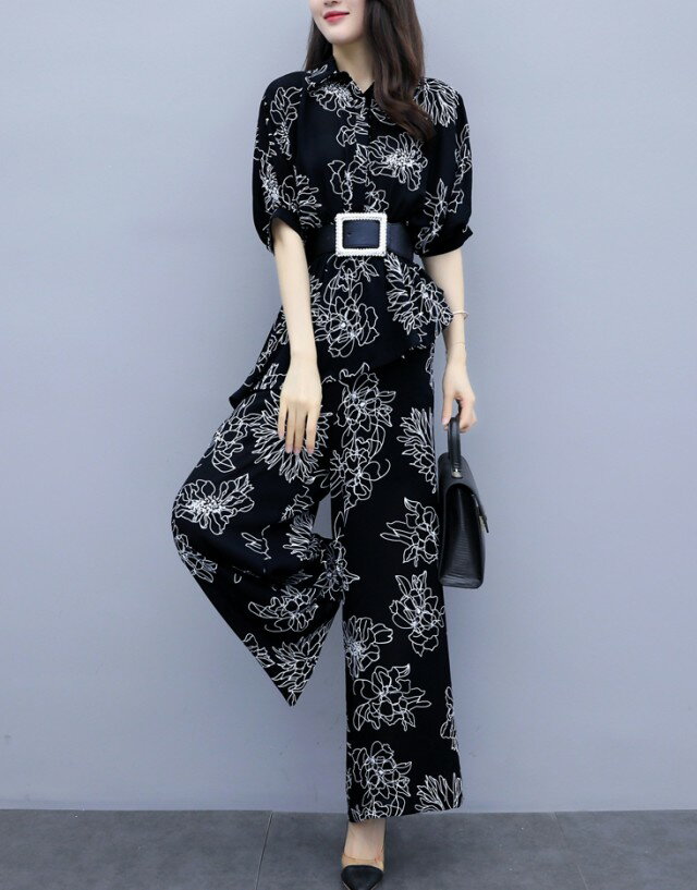 かっこいい パンツドレス セットアップ レディース パーティードレス 結婚式 お呼ばれ ドレス パンツスーツ 大きいサイズ 3L 黒 白 袖あり 花柄 総柄 ウエストマーク きれいめ ゆったり 体型カバー 通勤服 オフィス 20代 30代 40代 50代