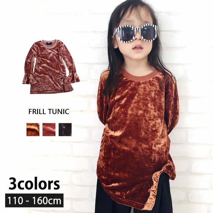 【599円均一】キッズ 子供服 フリルチュニック 女の子 ガールズ ベロア クラッシュベロア 韓国子供服 ワンピース Tシャツ ティーシャツ トップス カットソー ジュニア 110cm 120cm 130cm 140cm 150cm 160cm 「248-08」