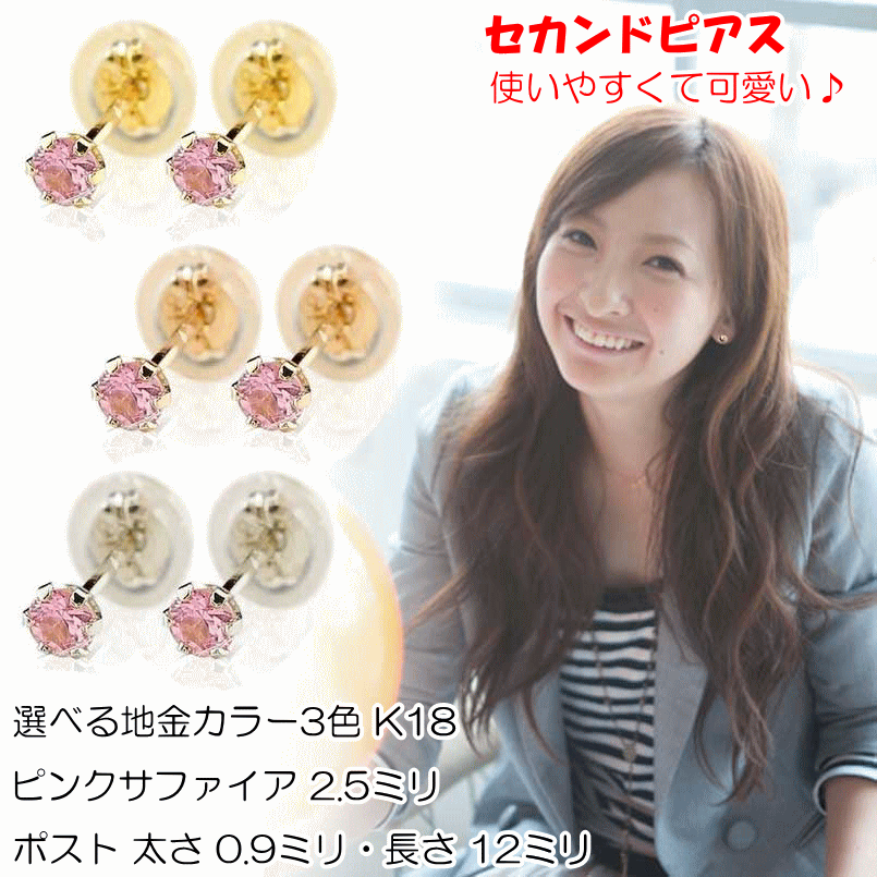 18金 セカンドピアス ピンクサファイア ピアス ゴールド k18 18k レディース シンプル スタッドピアス 9月誕生石 天然石 宝石 両耳用